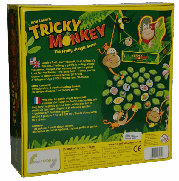 Gameplay: As all players play simultaneously let’s see who’s the fastest to win the fruit… Players must try and collect 6 fruit leaves before their fellow monkeys. If the gorilla collects all 6 fruit leaves first, then he wins the game. However there is an additional obstacle lurking in the jungle. If players are not careful, a hungry gorilla may swipe the fruits that they have gathered. A colorful Toucan can also bring you luck and give you a chance to win more fruit.